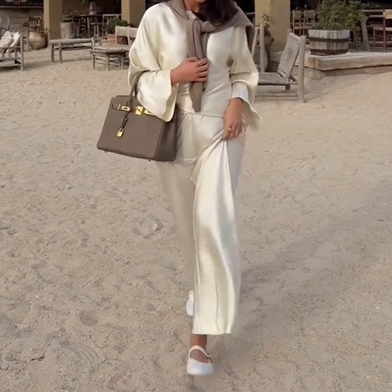 Silky and Elegant Satin Wide Neck Long Sleeve Loose Top and Elastic Waist Wide Leg Pants Set