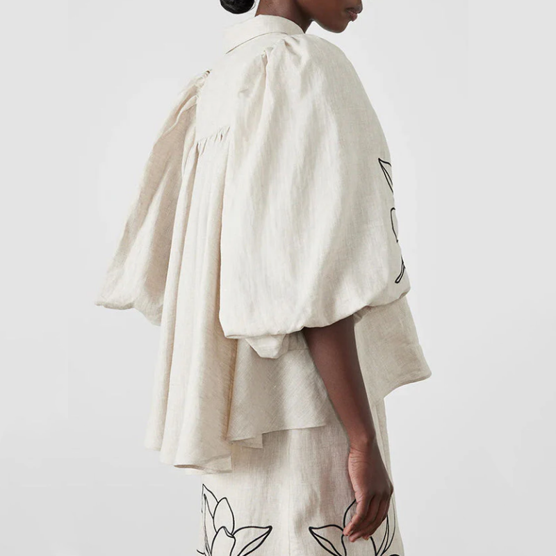 BALLOON SLEEVE DESIGN: The top features playful and chic balloon sleeves, complemented by a lapel collar and button detail, adding an elegant and trendy touch to the outfit.