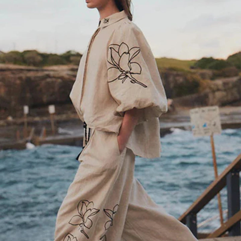 FLORAL PRINT: Both the top and pants are adorned with a black floral line print, creating a stylish yet understated look. The unique floral design breaks monotony and adds dynamic visual interest, making the outfit even more captivating.